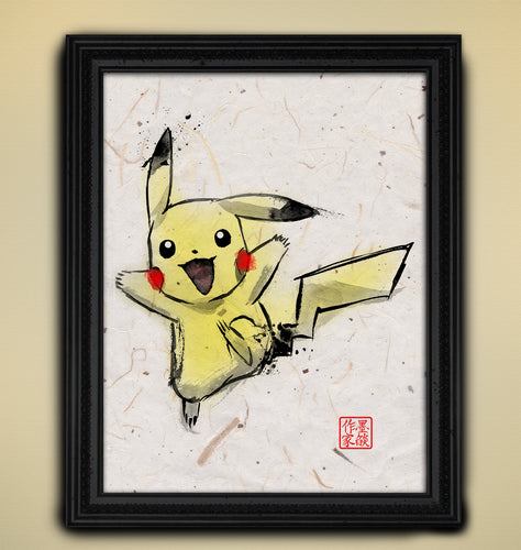 Pika! - Pikachu Pokemon Art print on Japanese Unryu, Map, Dictionary Page or any Specialty paper of your choice.